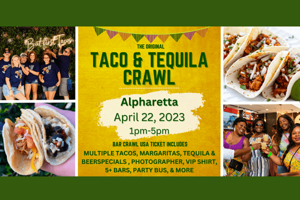 Since 2018 Bar Crawl USA & The Taco Crawl have joined together to bring the biggest & best Taco & Tequila Crawls around the nation, and we’re happy to announce that The Original Alpharetta Taco & Tequila Crawl is happening on April 22nd this year! Enjoy eating tacos, sipping margaritas, taking tequila shots, and dancing your taco loving butt off!